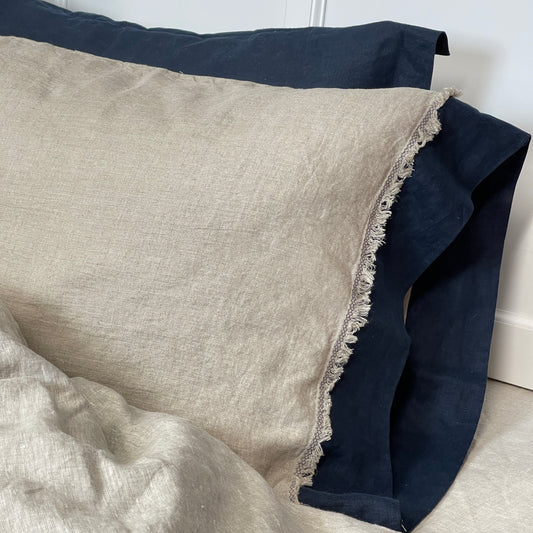 Greige Navy Blue Flax Pillowcase with Deco Detail