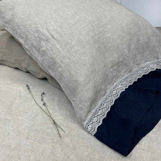 Greige Navy Blue Flax Pillowcase with Lace