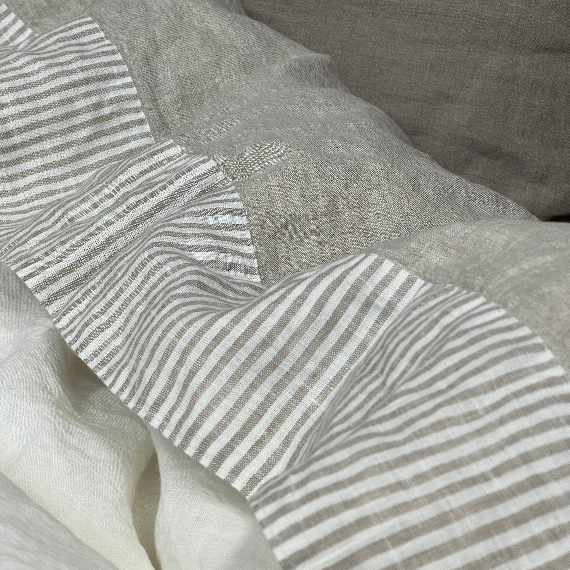 This pure linen flat sheet with striped decorative detail on the top looks beautiful. Luxuriously soft. Great for mixing and matching with our other products.