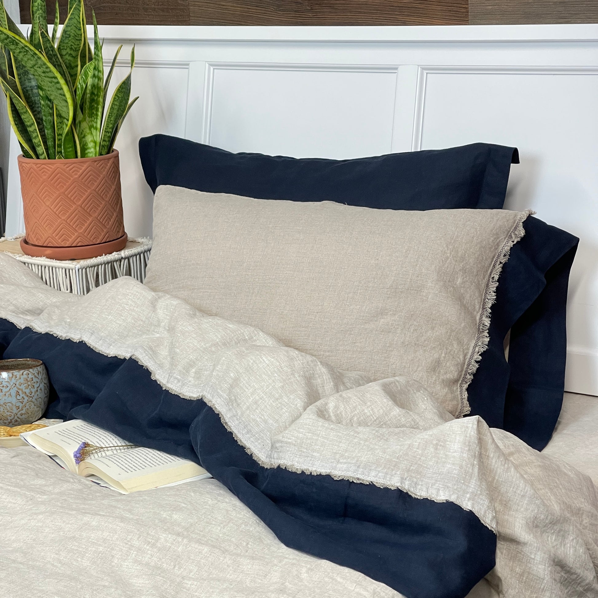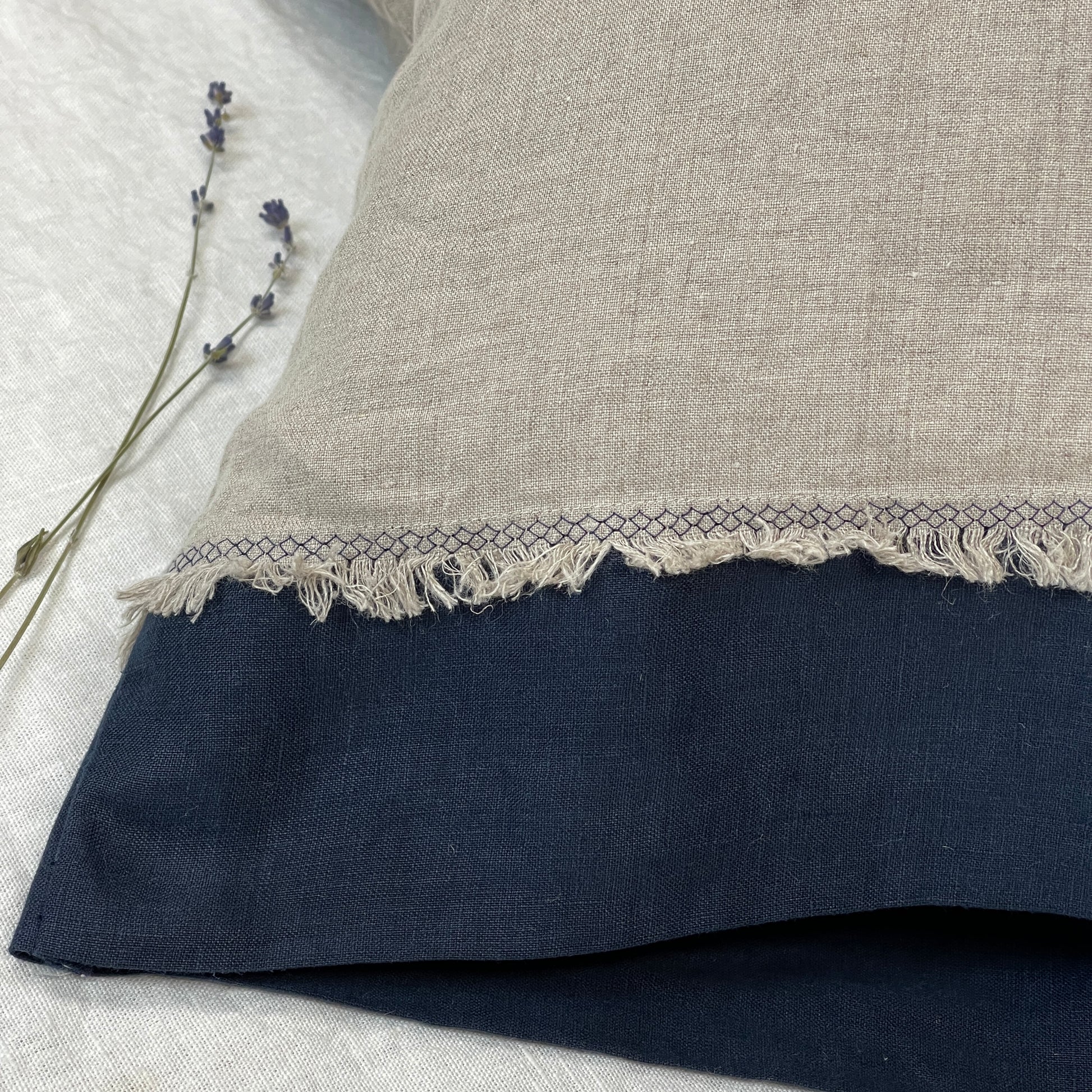 Greige Navy Blue Flax Pillowcase with Deco Detail